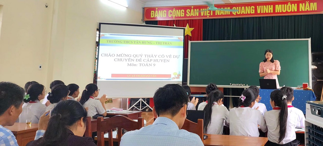 Đồng chí Đoàn Văn Thành-Trưởng phòng GD&ĐT huyện về dự chuyên đề và tặng hoa chúc mừng cô Lê Thị Khánh Vân.